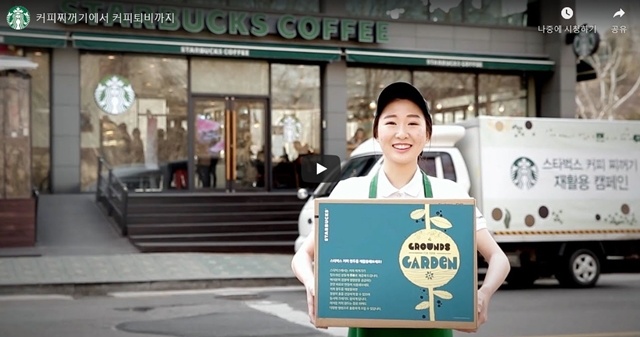 스타벅스의 ‘커피 찌꺼기에서 커피 퇴비까지’라는 동영상이 있습니다. 커피 찌꺼기를 활용해 천연비료로 만들어 농가에 제공하면, 농가에서는 우수한 농산물을 스타벅스에 제공한다는 내용으로 ‘커피 원두, 커피, 커피 찌꺼기, 커피 퇴비, 우리 농산물 제품’으로 이어지며 부가가치를 창출하는 공익활동을 보여주고 있습니다. 놀랍게도 커피 찌꺼기에는 폴리페놀, 무기질, 질소, 탄소, 칼륨 등이 풍부하므로 커피 찌꺼기를 토양과 1:9의 비율로 섞어 사용하면 양질의 천연비료로 만들어진다고 합니다. 스타벅스는 농가에서 커피 퇴비로 수확한 농산물로 ‘라이스 칩’, ‘넛츠 라이스 바’, ‘블랙빈 라이스 바’ 등 다양한 상품을 매장에서 판매하고 있습니다.