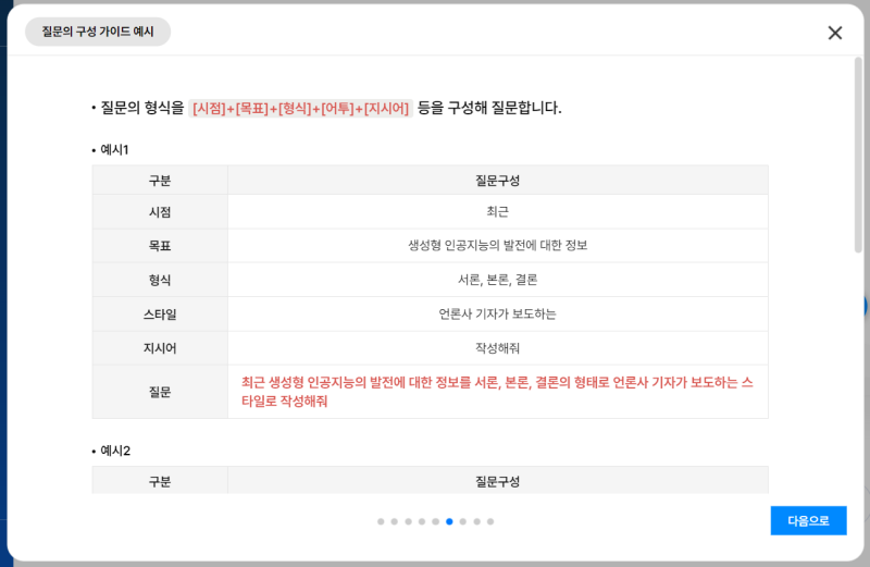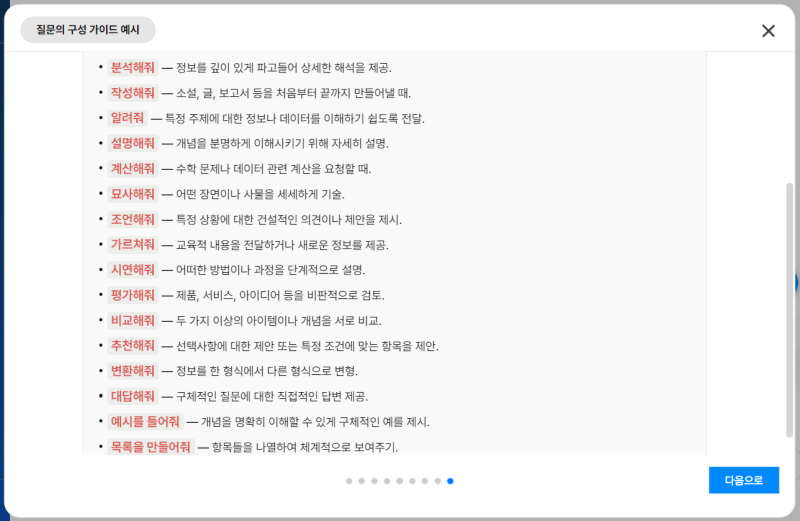 다음 화면으로 넘어가면, [사용자 가이드]가 꽤 자세히 나온다. 생성형 AI를 사용할 때 쓰는 프롬프트 기법과 비슷하다.