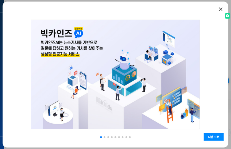 빅카인즈 사이트에 가면 [실험버전 AI] 메뉴가 있다. 클릭해 보면, 먼저 "빅카인지 AI" 소개와 가이드가 나온다. 빅카인즈 AI는 뉴스기사를 기반으로 질문에 답하고 원하는 기사를 찾아주는 생성형 인공지능 서비스라고 스스로 소개하고 있다.