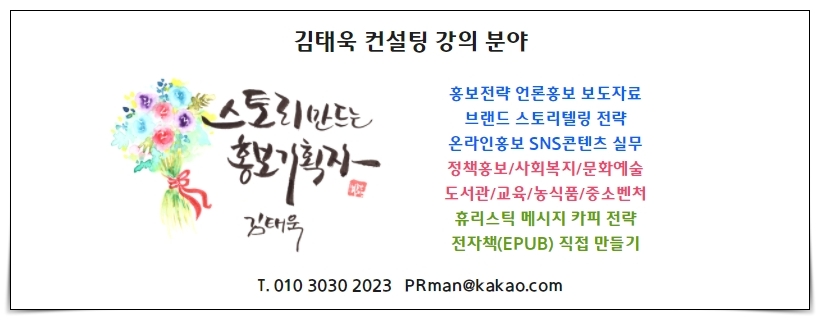 도서관에서 요청하는 강의는 크게 세 가지다. 먼저 <도서관홍보, 무엇을 어떻게 할까> 강의로, 전반적인 도서관 홍보 강의다. 두 번째는 <언론홍보 보도자료 작성> 강의로 보도자료 작성법에 관한 강의다. 그리고 <SNS를 활용한 홍보전략> 강의다. 주요 커리큘럼은 다음과 같다. 이를 중심으로 도서관 요청에 따라 맞춤형 커리큘럼으로 꾸민다.