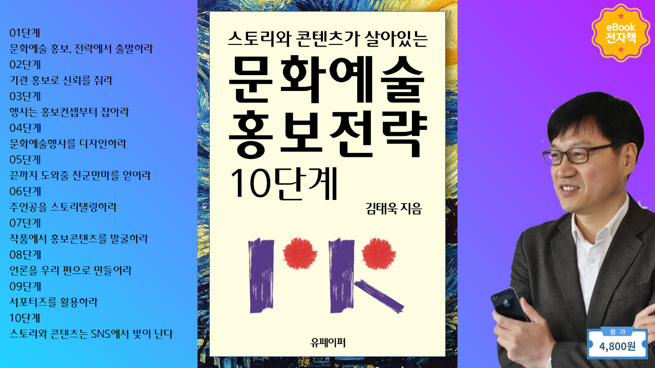 첫째는 《스토리와 콘텐츠가 살아있는 문화예술 홍보전략 10단계》이다. 이 전자책은 문화관광재단이나 문화예술행사 홍보담당자를 위한 실무 안내서다. 문화예술에는 스토리가 있고 콘텐츠가 담겼고, 문화예술 홍보는 그걸 찾아서 콘텐츠로 만들고 미디어에 배포하는 일이다. 주요내용은 홍보전략, 기관홍보, 행사 홍보컨셉, 디자인 홍보물, 임직원 홍보, 인물 스토리텔링, 홍보콘텐츠 발굴, 언론홍보, 서포터즈 활용 홍보, SNS 홍보로 구성했다.
