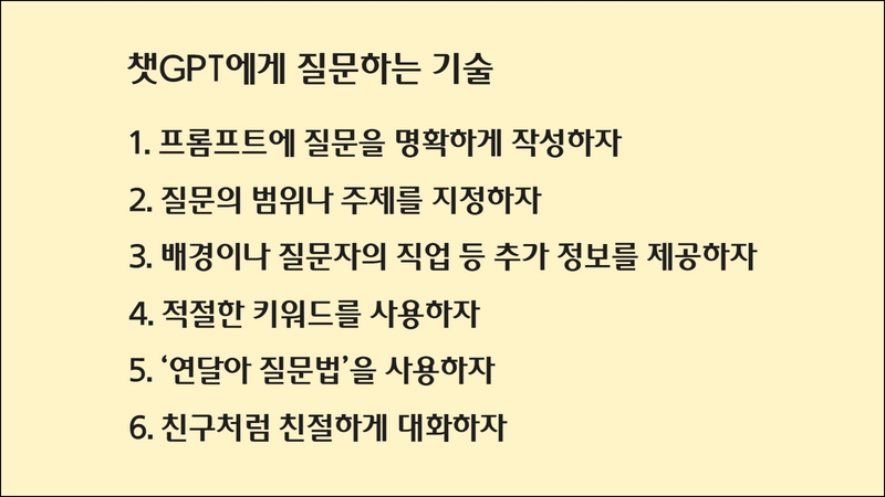 챗GPT는 현문현답을 원칙으로 한다. 그래서 질문을 잘해야 원하는 답을 얻을 수 있다. 챗GPT에게 질문하는 기술은 다음과 같다. 이러한 팁을 따르면, 챗GPT Prompt에서 더욱 정확하고 유용한 답변을 얻을 수 있다.