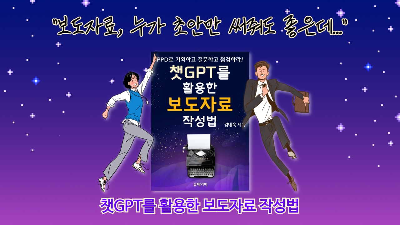 세 번째, 최근에 쓴 《챗GPT를 활용한 보도자료 전략, 2023》은 제목 그대로 챗GPT를 활용해서 가능한 쉽게 보도자료를 쓰는 방법을 정리한 전자책이다. 이 책은 보도자료 작성에 대한 기존 방식을 변화시키는 새로운 시도다. 그렇다고 AI 챗봇이 모든 걸 다해 주지는 않는다. 큰 그림을 그리고, 내용을 점검하고, 배포를 판단하는 일은 우리가 해야 한다. 우리는 AI 챗봇의 팀장이자 데스크다. 챗GPT는 우리를 도와주는 비서역할을 한다고 볼 수 있다.