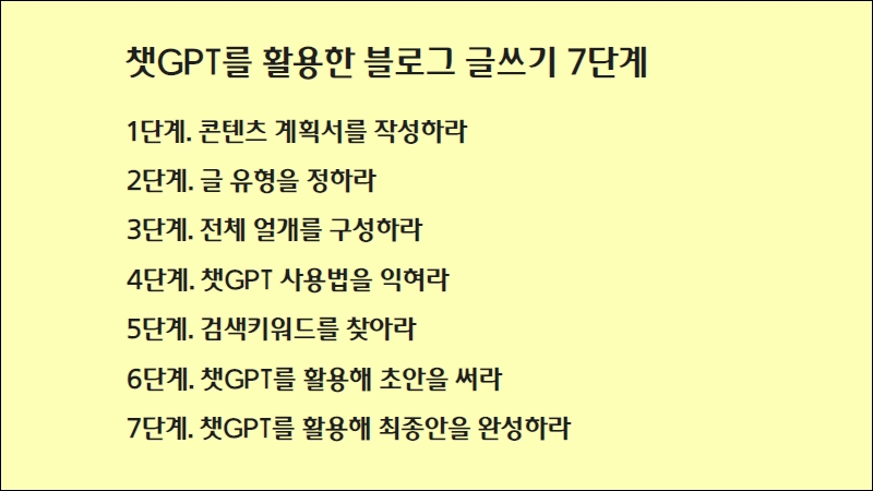 그래서 필자는 전자책 ‘챗GPT를 활용한 블로그 홍보 글쓰기’를 집필했다. AI 챗봇 중 하나인 챗GPT를 활용해 제대로 된 블로그 글을 쓰는 방법을 담았다. 이 책은 모두 일곱 단계로 구성되었다. 1, 2, 3단계는 블로그 콘텐츠 준비 단계로 콘텐츠 계획서를 작성하고, 글 유형을 정하고, 글의 구조인 얼개를 그리는 단계다. 그리고 4, 5, 6, 7단계가 챗GPT를 활용해 검색키워드를 찾고, 프롬프트에 질문하고 요청하며 초안을 작업하고 최종안까지 점검하는 글쓰기 단계다. 모든 과정을 챗GPT가 해주는 건 아니다. 기획과 점검은 담당자의 몫이다.