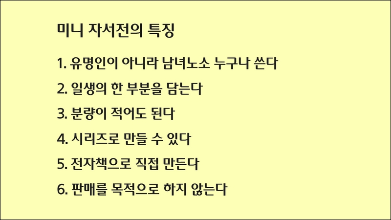 그래서 필자는 미니 자서전을 권한다. 미니 자서전(Mini autobiography)은 말 그대로 작은 자서전이다. 기존의 자서전이 특별한 사람의 특별한 이야기를 길고 거창하게 쓰는 거라면, 미니 자서전은 보통 사람의 보통 이야기를 짧게 소박하게 쓰는 거다. 즉, 미니 자서전은 누구나 쓸 수 있고, 너무 거창하지 않아도 되고, 심각하지 않고 재밌게 쓰고, 쉽게 쓰고 쉽게 책으로 만들 수 있어야 한다. 미니 자서전의 특징은 다음과 같다.